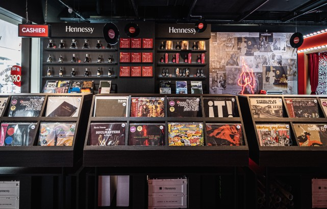现场三大空间,以黑胶音乐为引,串联不同体验:踏进店内,第一眼便是琳琅满目的黑胶唱片,此处是「唱片店」,亦是轩尼诗零售空间。无论你喜欢的曲风、流派,还是轩尼诗的各个系列产品,都可以在这里无拘无束地自由探索。