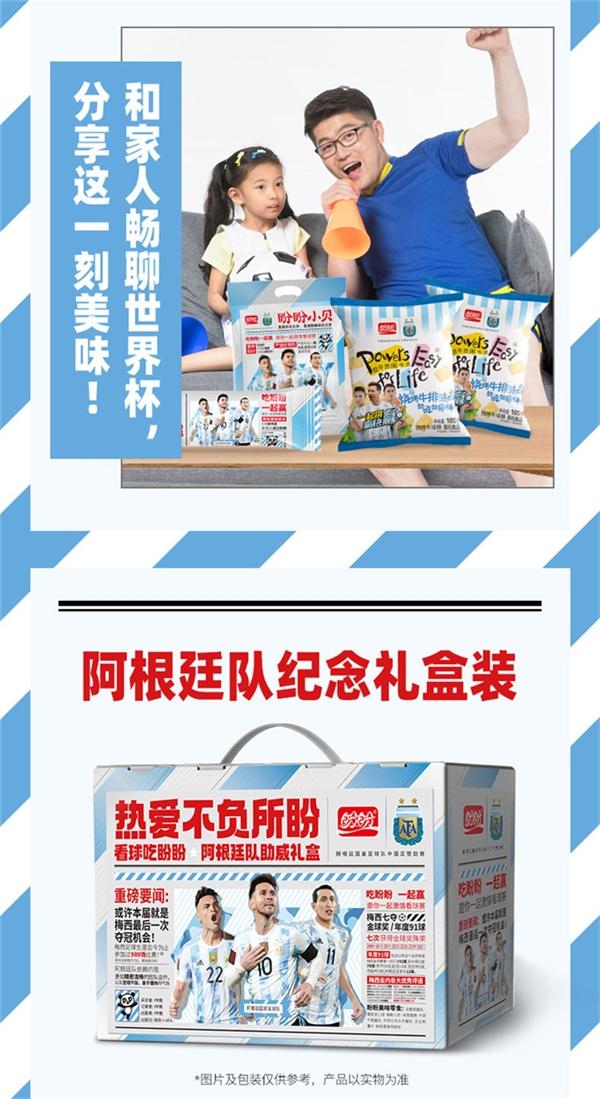 盼盼食品不仅推出了阿根廷马黛茶味的麦香鸡味块,让海内外球迷品尝潘帕斯雄鹰的家乡之味,更精心设计、搭配、推出了“阿根廷助威零食大礼盒”,让追赛球迷与广大消费者能够在赛场外也能感受浓浓的世界杯氛围。