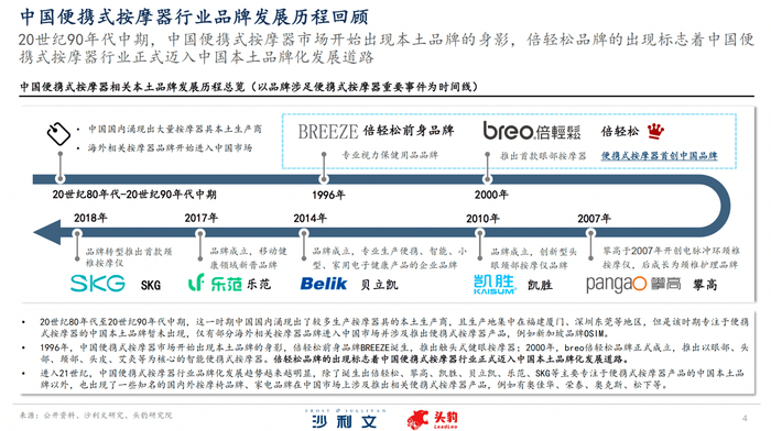 现代按摩器产品起源于20世纪50年代的日本。20世纪80年代至90年代中期,我国涌现出了较多生产按摩器具的本土生产商,但彼时还未出现专注于便携式按摩器的中国本土品牌。直至1996年倍轻松前身品牌BREEZE诞生,推出触头式健眼按摩器,到2000年breo倍轻松品牌正式成立,也标志着了中国便携式按摩器行业正式迈入了中国本土品牌化发展道路。进入21世纪,伴随着中国制造的崛起,更多专注于便携式按摩器产品的中国本土品牌涌现,中国已然成为了全球最大的按摩器产品(包含大型按摩器和小型便携式按摩器)生产销售市场。倍轻松正是便携式按摩器领域的佼佼者。