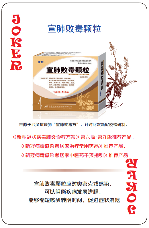 宣肺败毒颗粒来源于武汉抗疫的“宣肺败毒方”,是中国工程院院士张伯礼教授和北京中医医院刘清泉教授在武汉方舱医院针对新型冠状病毒感染肺炎疫情所研制的有效治疗方。在武汉疫情期间,于武汉定点医院、方舱医院和隔离点中得到广泛应用,对控制疫情蔓延、减少重症发生等方面发挥了重要作用。在方舱医院患者的治疗中实现了零转重,零复阳的效果。《宣肺败毒颗粒治疗奥密克戎毒株感染新型冠状病毒肺炎临床疗效评价研究》显示,宣肺败毒颗粒对于奥密克戎毒株感COVID-19 患者的治疗中,具有良好的有效性及安全性,能够促进症状(发热、咳嗽、咳痰、咽喉不适、口干)消退,缩短病毒核酸转阴时间及住院时间。近期发布的《宣肺败毒颗粒临床应用专家共识》中,宣肺败毒颗粒治疗轻型、普通型新冠肺炎强推荐。除了新冠肺炎,在其他呼吸系统感染性疾病的症状治疗上也推荐使用。