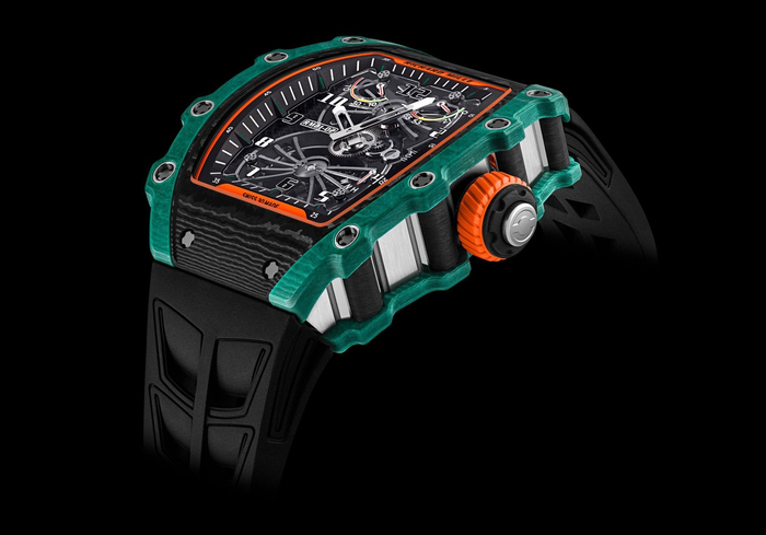 最让人啧啧称奇的是RM 032的表冠设计。RM 032具有锁定功能的表冠,在深海潜水时,按键和表冠承受的水压足以在无意间触动某个按键,如计时码表的“启动”键。只要旋转RM 032表冠旁的表圈,就可以轻松锁定表冠和按键,防止对表冠的重压或震动而损坏机芯,并还通过加强密封圈提高防水性能。该创新装置为RM 032所特有并已申请专利。