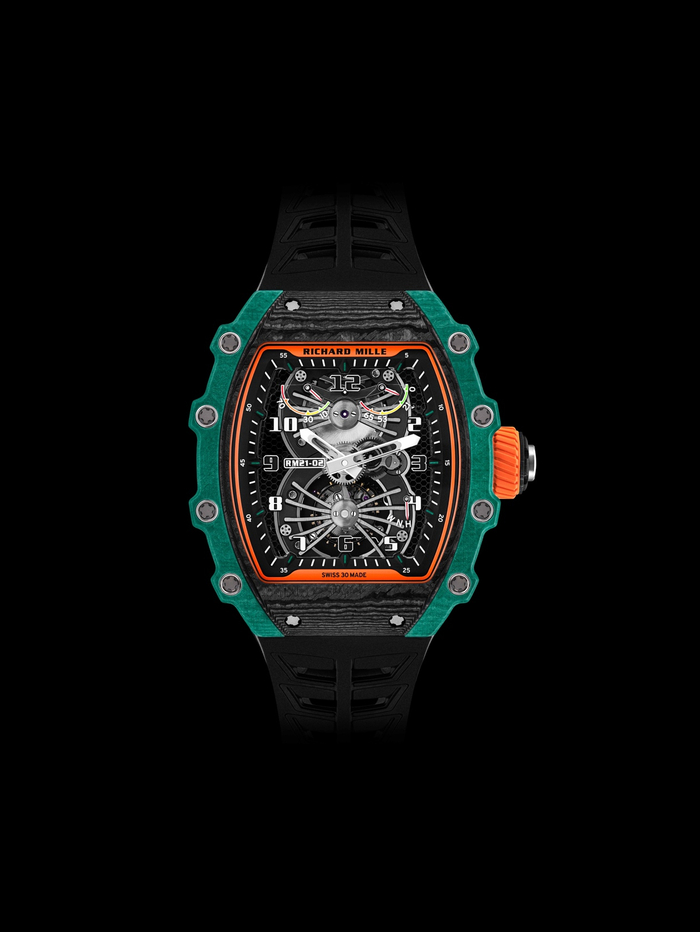RM 21-02腕表的表壳结构复杂,由三种不同材质构成。表圈以Carbon TPT®碳纤维和绿色Quartz TPT®石英纤维制成:这两种材质均具有独特的外观。其中绿色Quartz TPT®石英纤维的制造,需要先将碳纤维或二氧化硅分离出细丝,再将其平行排成薄层,这些薄层复合形成该材料,因此其非凡的表面呈现规律的波纹。这些纤维层的厚度不超过45微米,在浸泡于黑色和绿色模具中之后,再使用特制机器织成,层与层之间呈45°角交错。随后,将材料在6巴的压力下加热至120度,之后便可以将其送至RICHARD MILLE的表壳制造厂加工成型。
