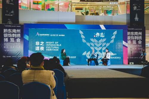 17日晚,各方嘉宾齐聚一堂,欣赏了黔东南著名的非物质文化遗产——侗族大歌、芦笙演奏和琵琶歌等等,也通过服饰走秀向观众展示了黔东南传统的民族服饰和色彩搭配。活动现场还邀请了《王的手创》联合创始人饶勇、ARTIST TIME艺术品牌主理人马晓海二位专家浅谈了他们对艺术、非遗、文创工艺品和银饰刺绣等等话题的独特见解。此外在非遗之夜上,黔东南州银饰刺绣博览会发布了包括 “乐裳”、“黔礼季”及“东楠东西”三个品牌在内的品牌计划,知名音乐人、《苗族情歌》非物质文化遗产传承人蝶长演唱的苗语改编歌曲《一生所爱》将非遗之夜推向了高潮,展现了一场精彩纷呈的非遗视听盛宴。