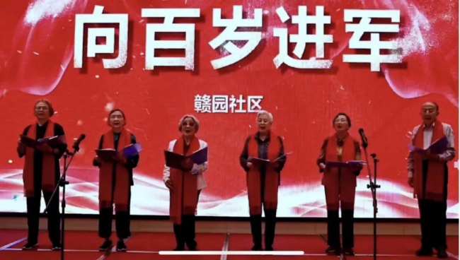 “向着七十岁,不,向八十、九十,一百岁进军!在人生的又一次远行中,与同伴们来一场竞赛吧……”谈起自己对诗歌《向百岁进军》的感想,身为主创之一的韩乃英阿姨动情说道:“我现在已经近90了,我进赣园以后感到无论在饮食方面、居住方面、娱乐方面,以及文化、体育锻炼等等,对我非常有益。我们朗诵向百岁进军,我争取一年走一小步,五年走一大步,向百岁进军!”