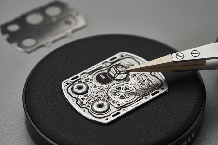 挑战超薄腕表需要摒弃叠加齿轮和指针的传统机芯设计。因此,RICHARD MILLE 选择将无法叠加的零部件,分散到更宽的平面,创造出机芯与表壳的完美共生,同时彼此间保证两者所必须的刚性。为保证传动机制的理想运行状态,底板和桥板均以五级钛合金制成,在不影响硬度的情况下,保证完美的纤薄度。获得专利的超薄发条盒配备极细游丝,而擒纵结构则全部重新设计。