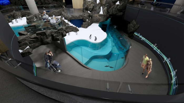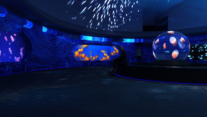 海梦一方Dream Gala的空中海洋馆共将引入300余种海洋生物,并搭建有全国最大水母剧场、全国最大企鹅岛以及一个海底观景隧道。海洋馆的参观时长动线长达2小时左右,超脱了区域商业的产品组合,带有轻度假的特色基因。