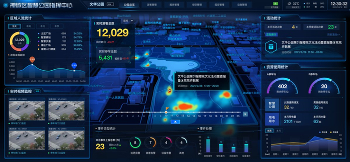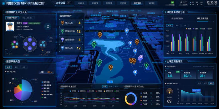 一张图统筹管理整个园林,集成养护管理、资产管理、巡更巡检、环境监测、能耗监测等数据资源,通过园林要素和事件的智能化识别、跟踪、分析和管理,利用物联感知、GIS地理信息等技术,实现“全域性、全天候、全覆盖”的园林监管体系。