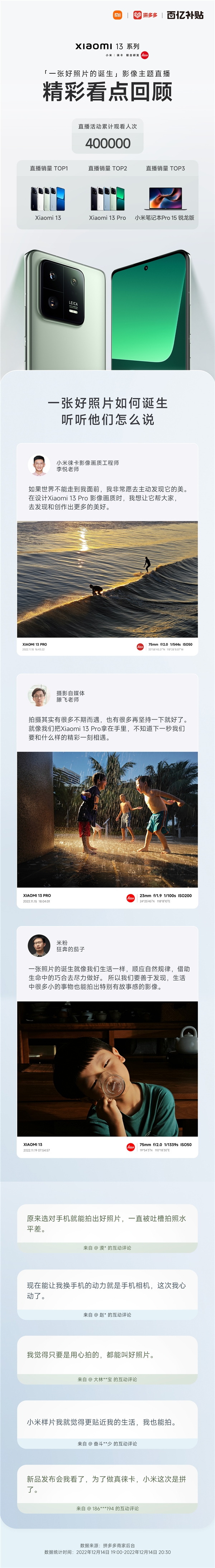 12月14日当晚19:00-20:30,小米拼多多官方旗舰店直播间同步开启主题为“一张好照片的诞生”的直播,并特别邀请了小米徕卡影像画质工程师、独立专业摄影师以及米粉朋友,共同探讨如何拍照一张好的照片,以及他们自己的拍摄故事。直播过程中,现场嘉宾金句频出,观看直播用户互动真情流露,整场直播聚焦小米13系列产品及影像。