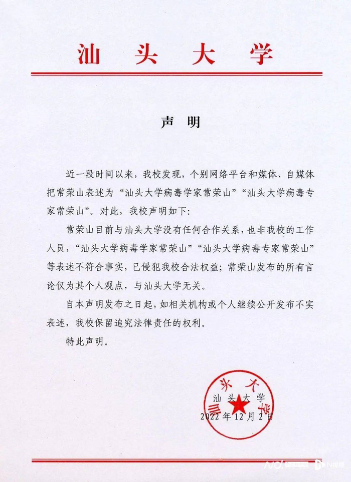 针对近期网络上有文章将常荣山表述为“汕头大学病毒学家常荣山”“汕头大学病毒专家常荣山”的情况,昨晚( 12月8日),汕头大学通过官方微信公众号发布《声明》称,常荣山目前与汕头大学没有任何合作关系,也非该校工作人员。