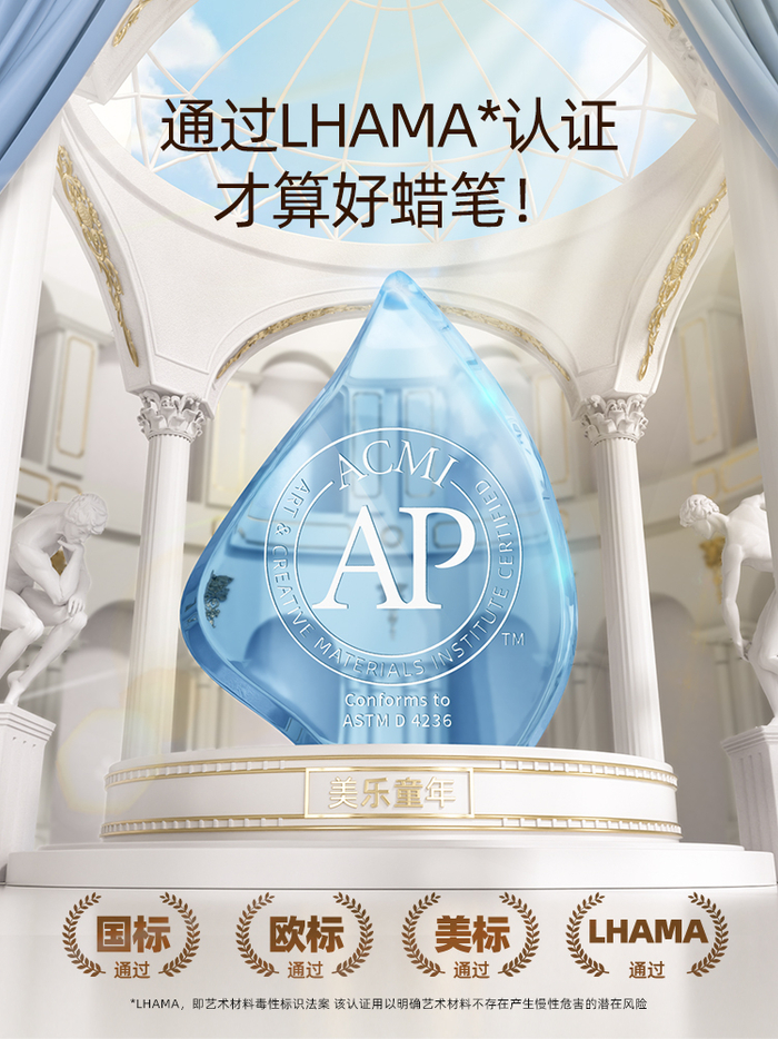 美乐童年丝滑蜡笔为宝宝带来“从内到外”的安全:它通过欧标、国标、美标及LHAMA(艺术材料毒性标识法案)认证,相比于普通蜡笔,拥有更加严格的“双国标”认证,是幼儿使用的安心之选。原料为安全色素,即使不小心误食也不用太担心。旋转笔头不脏手,而且比普通蜡笔的透气孔更大,防止短时间窒息,争取宝贵抢救时间。