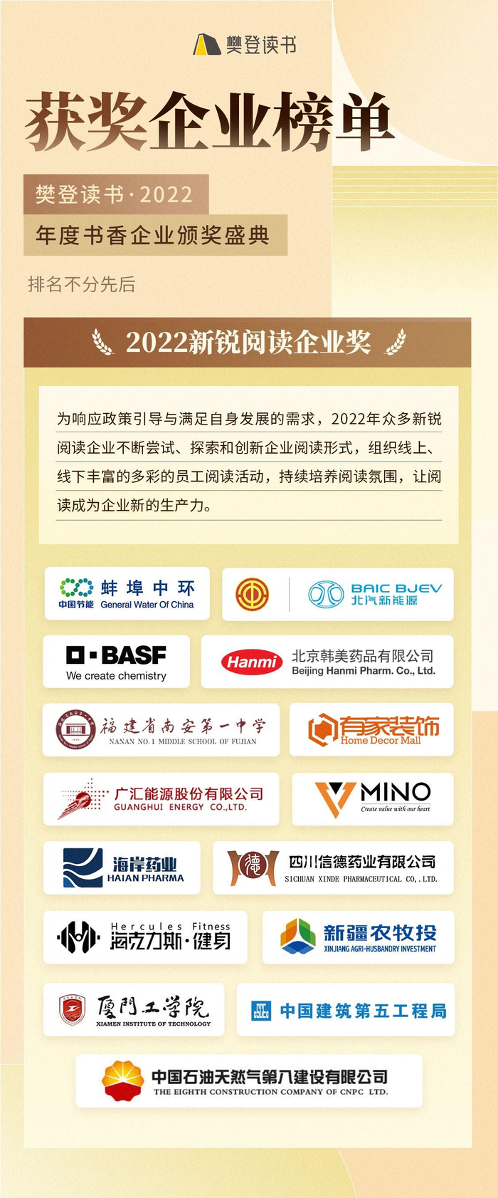 在本次评选中,还有15家企业入选“新锐阅读企业”奖项,领跑读书新风尚。在新锐阅读企业的读书实践案例中,同样能看到它们在推广阅读工作中做出的优秀成绩。中油八建、中建五局、海克力斯健身追求建设有温度的幸福企业,在线上线下推出系列活动,让员工悦享读书之趣;明珞装备、海岸药业与厦门工学院注重设置企业阅读计划,靠读书创造企业价值,以优带群,开展全员共读;新疆农牧投集团、广汇能源则聚焦学以致用,力图通过有效的学习活动促进员工实践能力提升;而福州有家装饰工程有限公司、福建省南安第一中学、北京新能源汽车股份有限公司、北京韩美药品、四川信德药业则希望阅读成为终身习惯,依靠持久、多元、多主体的读书活动传递阅读理念,让每一个企业成员成为更好的自己;蚌埠中环水务、巴斯夫农业解决方案部倡导快乐阅读,挖掘有趣味更精彩的读书交流活动,助力企业全员阅读。