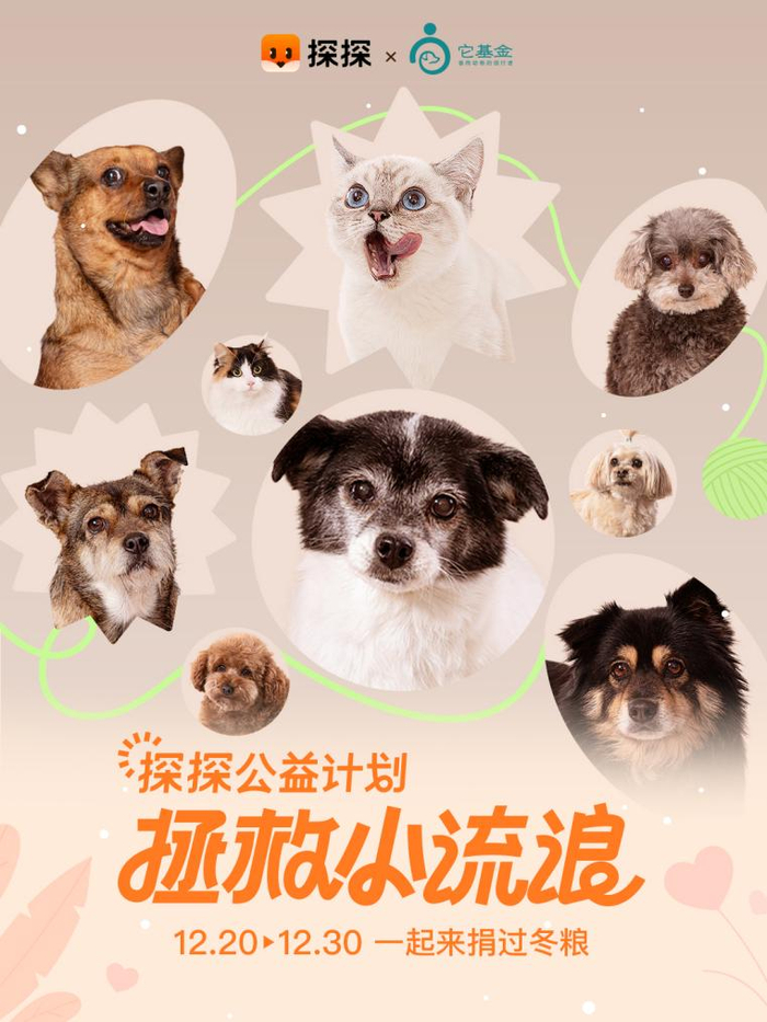 随着冬天的到来,粮食短缺、居无定所成为了困扰流浪动物生存的两大难题。为了帮助更多流浪动物度过寒冬,国内知名社交平台探探与它基金将在12月20至30日期间共同启动“拯救小流浪”公益计划,活动预计捐赠10吨宠物粮,这也是探探平台与它基金连续三年落地该公益计划。