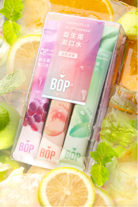 在成分上,BOP漱口水采用Bio-Fresh益生菌复合配方、零酒精、零蔗糖。对比传统漱口水以酒精为主要抑菌成分,BOP漱口水选择度米芬等温和抑菌剂,温和不刺激,拥有果味、茶味等饮料化口味,给年轻消费者更好的产品体验。