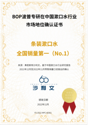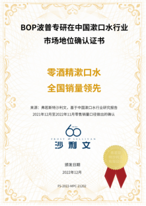 近日,基于对中国漱口水市场的调研和分析,以及对业内相关公司的研究和评估,知名增长咨询公司弗若斯特沙利文(Frost & Sullivan,简称“沙利文”)授予BOP波普专研“条装漱口水全国销量NO.1”“零酒精漱口水全国销量领先”市场地位确认书。BOP波普专研作为头部漱口水品牌,条装漱口水已售出1亿条。