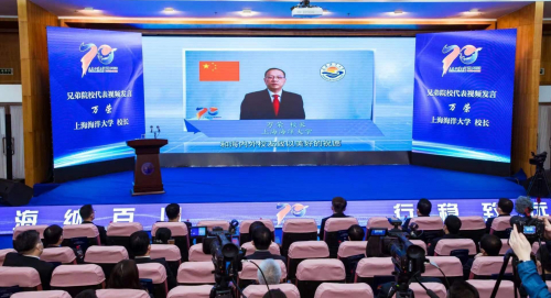 于志刚在致辞中指出,中国海洋大学与大连海洋大学同为海洋领域高等学府,两校在人才培养、科技创新、社会服务等方面不断加强交流合作,取得累累硕果,结下了深厚情谊,为海洋强国建设做出了应有的贡献。中国海洋大学愿与我校一起,同舟共济,携手并进,为加快建设海洋强国、实现中华民族伟大复兴谱写更加壮美的蓝色华章;万荣在致辞中指出,上海海洋大学和大连海洋大学曾同为农业农村部直属水产类高等学府,70年携手共进,两校始终保持着紧密的联系,为国家海洋水产事业培养了大批优秀人才,有力支撑了国家水产海洋科技领域的创新发展。站在新的历史起点上,上海海洋大学愿同我校一道,建设更高水平的海洋大学,为海洋强国、科教兴国、人才发展、创新驱动发展等国家重大战略作出更大的贡献。
