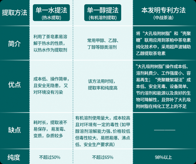 目前行业常用的茶皂素提取方法主要是单一水提法和单一醇提法,本发明专利方法与这两种提取方法对比,优势显著,纯度从单一水提法不超过50%、单一醇提法的不超过65%,提升至98%以上。该方法不仅在纯度、得率上取得重大突破,同时还具有设备简单、操作成本低、溶剂耗费少、工作强度小、容易再生、安全无毒、良好的生物可降解性等优势(详见下图)。