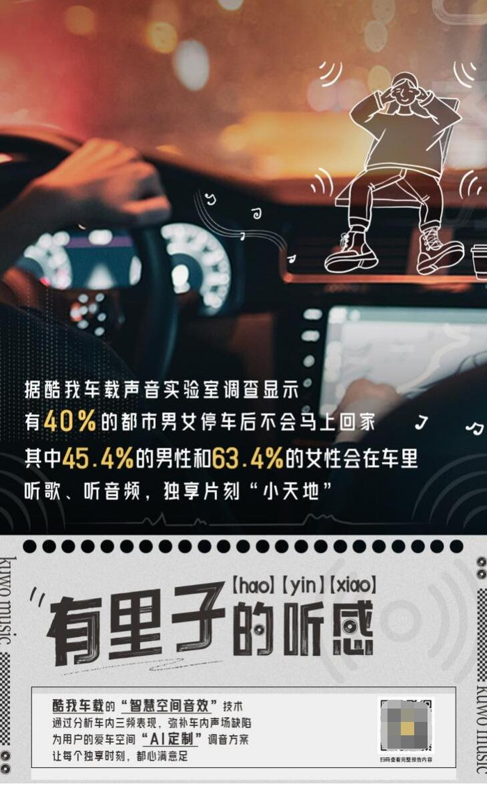 其次是通过AI定制,让“听感”个性愉悦。酷我车载声音实验室发现,当今时代生活节奏快,压力大,40%的都市男女停车后不会马上回家,其中45.4 %男性和63.4%女性会留在车里听歌、听音频,独享片刻“小天地”。