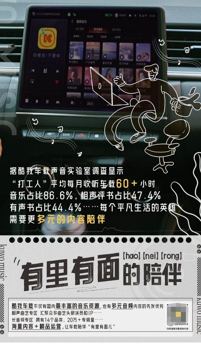 酷我车载声音实验室发现,“打工人”的需求其实是多样化的,在平均每月60小时以上的收听时间内,音乐占比86.6%,相声评书占比47.4%,有声书占比44.4%。