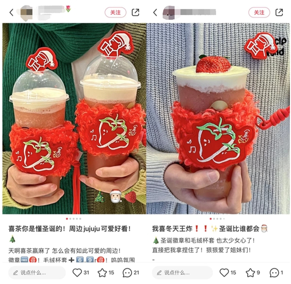 包含真果毛绒杯套在内,喜茶还配合产品上线了氛围感十足的阿喜毛绒徽章等周边。徽章中,喜茶logo形象阿喜变身为大口喝茶的“圣诞阿喜”。而毛绒杯套不仅让冬天的饮品不再冻手,鲜艳的颜色和毛茸茸的质感更是冬日出片神器,配合草莓饮品的红色杯身和雪白轻芝士顶,瞬间拥有温暖的节日仪式感。