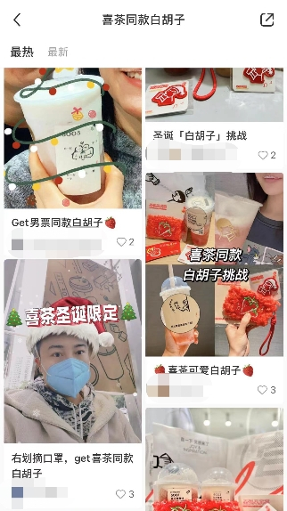 轻芝莓莓桃、轻芝莓莓灵感来自于喜茶于2017年推出的行业首款芝士果茶类产品芝芝莓莓。芝芝莓莓同样也是行业内首款芝士水果茶,通过芝士搭配真果,以冰沙、半冰沙形态的果茶产品更好地传递了水果的鲜感和风味,令水果“真的可以喝”。芝士果茶产品后续也在行业内得到了广泛应用,逐渐成为市场上最主要的水果茶产品品类。今年,喜茶轻芝莓莓桃等推出之后,网友们将45度大口喝喜茶的经典饮用方式与圣诞氛围相结合,纷纷下单饮品并解锁#喜茶同款白胡子#的拍照姿势。