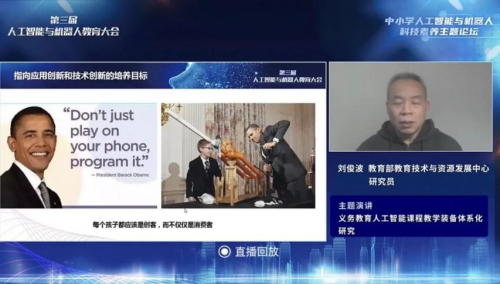01.人工智能时代“成长课本”大迭代大会上,来自教育部教育技术与资源发展中心的研究员刘俊波老师,分享了教育部教育技术与资源发展中心在人工智能课程教学装备体系化领域的研究成果。刘俊波老师指出,义务教育人工智能教学装备体系化设计应从三个维度考虑:内容体系化,即要反映人工智能的核心内容;素养层次体系化;对教学支持的体系化。尤其是在课程设置方面,针对国家课程、地方课程、校本课程、科技竞赛等不同领域,形成浅而宽和窄而深的辩证统一,在科技认知方面形成足够体系化的教育方法。