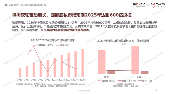根据CBNData发布的《后疫情时代面部底妆趋势洞察报告》中,彩妆赛道的相对 “减速”,越发凸显彩妆子品类的增长韧性,底妆品类被称为“彩妆中的护肤品”。数据显示,过去三年,面部底妆在各个彩妆类目中抗压力表现最为突出。作为面部彩妆行业线上销售规模最大的细分市场,截至2022年9月,面部底妆销售额占彩妆大盘比为33.86%,连续三年保持正增长。预计2025年中国底妆市场规模将突破600亿元。