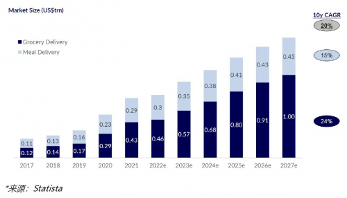 根据中信里昂证券的分析,目前全球外卖配送市场的规模巨大,并且在不断的增长。预计截至到2027年整体的外卖市场的GMV都将以20%的复合年均增长率高速增长,这里中包含了有望全球GMV达到4500亿美元的食品外卖市场和1万亿的日用品生鲜外卖市场。