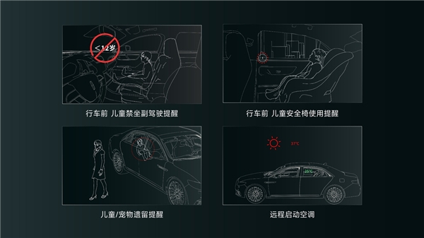 当有儿童上车并前排落座时,ADiGO SPACE会主动发出提醒建议儿童后排落座。车辆起步后,当系统感知到后排有儿童时,即自动打开后排儿童锁,防止儿童在行车途中突然开门或开窗引发意外。儿童落座后,播放系统还会贴心地自动推荐儿童相关的歌单。当下电锁车后,若系统感知到有儿童遗留在车内时,会及时通过短信或APP给车主手机发出告警提醒。如果车主在特定时间内没有反馈,车辆还会根据当前环境智能采取开启空调、降窗等措施,从多方面避免儿童独自滞留车内造成的安全隐患。