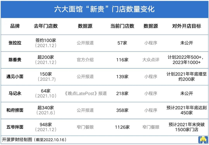 菠萝财经根据公开信息统计这六大面馆“新贵”截至发稿的门店数,并对照去年的数据得出结论:张拉拉手撕牛肉面(下称张拉拉)、陈香贵兰州牛肉面(下称陈香贵)以及遇见小面的门店数,不增反降;马记永兰州牛肉面(下称马记永)、和府捞面和五爷拌面的门店数虽然在增加,但开店速度大不如前。餐饮赛道投资人李蔡对开菠萝财经形容,六大面馆“新贵”去年“开店热”,今年“闭店潮”,“有的是疫情影响下的批量关店,有的是大举扩张后的门店调整”。