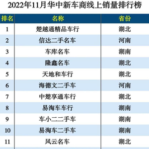 当家庭用车在人们生活中越来越普遍,人们对家庭用车的要求也变得与以前有所不同。和传统的购车观念不同,人们如今买车更看重实用性,想要花更少的钱,买到更好的车。相对于新车而言,二手车价格更低、性价比更高,日常开车不怕小剐蹭,将来转手损失也小,因而逐渐受到人们的认可乃至欢迎。但是二手车一车一况一价,普通人想要买到合适的二手车,并不容易。近日,瓜子二手车联合互联网业界权威杂志《互联网周刊》,发布了2022年11月华中地区二手车新车商销量排行榜,为想要购买二手车不知道如何选车商的朋友们提供了参考。