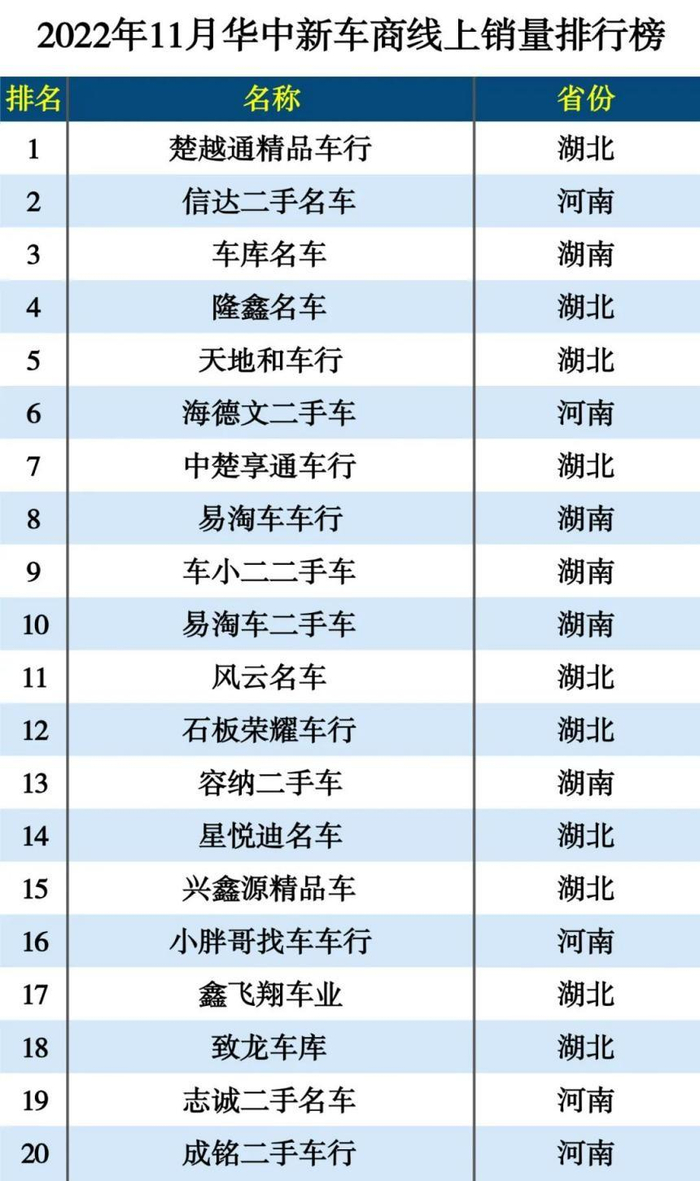 在2022年11月华中地区二手车新车商销量排行榜中,湖南共有五家新车商上榜,其中,湖南车库名车杀入榜单前三甲,湖南易淘车车行、车小二二手车、易淘车二手车则强势入围前十名,位列第八至十名。另外,湖南容纳二手车位列榜单第十三名。