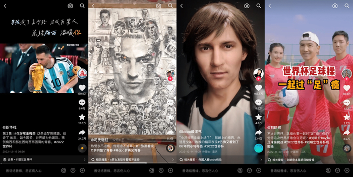 新华社也加入应援氛围组,分别为梅西和C罗制作了专属视频。其中以梅西为主人公的视频《终成球王》,带观众回顾了梅西的五届世界杯之旅,目前该视频点赞已经超过百万。刘畊宏也在世界杯期间编排了新操“足球啦啦操”,其在卡塔尔直播跳操的看播超过日常4倍达到1300万,带动“边看球边健身”的热潮。