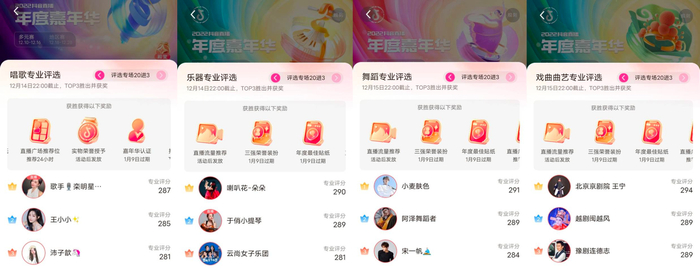 在专业评选部分,12月14日-12月15日,唱歌、乐器、舞蹈、戏曲曲艺四大专业评选赛道陆续上演巅峰对决,由各领域专业人士担任导师,从专业角度打出评分,选出年度优质内容主播。经过精彩的竞演,唱歌专业评选、乐器专业评选、跳舞专业评选、戏曲曲艺专业评选共评出12位荣耀主播,其中@歌手栾明星、@喇叭花-朵朵、@小麦肤色、@北京京剧院 王宁分别以优秀的表现夺得所在赛道第一名。