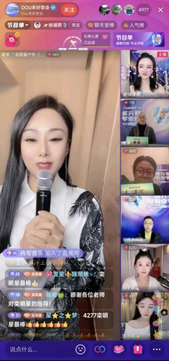 在唱歌专业评选专场,@王小小演唱的《光亮》 温暖有力,歌声中层层递进的细腻情绪表达引发共鸣,获得导师和观众夸赞。@沛子歆带来的《我认》惊艳全场,用婉转清透嗓音轻轻诉说着爱情故事。唱歌主播们的表演极具表现力和感染力,他们有的用饱满的情绪唱响民歌,有的深情演绎流行音乐,有的以专业唱功征服观众,评论区“好听”“加油”的鼓励不断,最终以高音见长的@歌手栾明星将歌曲《存在》唱出了个人特色,展现了超强的唱功,赢得了导师和观众一致好评,拿下唱歌评选专场第一名。