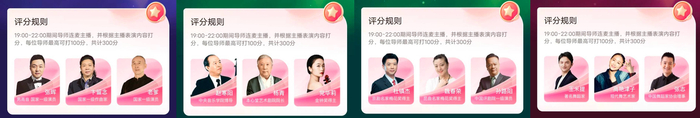 为了提升赛程的专业水准和大众影响力,此次多元赛四大专业评选专场邀请到多名行业专家担任导师,在直播间为参赛主播实时打分与点评。国家一级演员张晖、国家一级作曲家卞留念、国家一级演员刘建国(老爹)担任唱歌专业评选专场导师;乐器专场则邀请到中央音乐学院博导赵寒阳、本心堂艺术剧院院长杨青和金钟奖得主党华莉担任导师;在戏曲曲艺评选专场导师由京剧名家、梅花奖得主杜镇杰,昆曲名家、梅花奖得主魏春荣和中国评剧院一级演员孙路阳担任;著名舞蹈家玉米提、现代舞艺术家高艳津子、中国舞蹈家协会理事张志则出任舞蹈专场导师。专业人士的鼎力助阵,保障了各评选专场的权威性和专业性,也为主播的专业成长提供了助力。