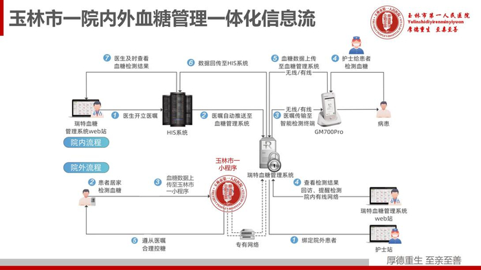 除此之外,该系统还为该院打通院内外血糖管理一体化流程提供了闭环解决方案。患者出院后通过绑定操作,使用华广瑞特血糖仪量测的数据上传至玉林市一小程序,并通过专有网络同步至院内血糖管理系统,医生即可在系统端查看到患者的居家量测血糖数据,同时可在线指导监测、用药、科普教育等,保持医患沟通,实现全病程持续管理。