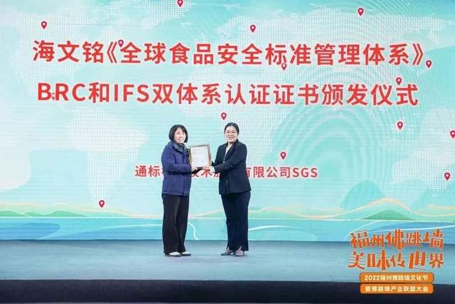 作为福州首家获得BRC和IFS双体系认证证书的企业,海文铭副总经理洪惠娜表示:“《标准》的发布不仅能够推进产业更好地发展,还能够让消费者品尝到更正宗、更安全、更地道的佛跳墙。”