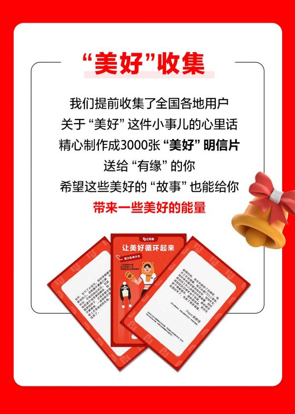 为了将美好循环,圣诞前红布林收集了全国各地宝藏青年们 “美好”的小故事和心里话,并制成了100张“美好”明信片。12月21日-12月25日,在红布林下单将有机会获得福袋和明信片。