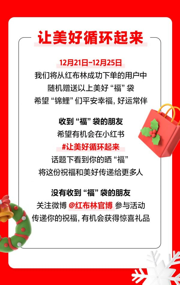 与此同时,红布林希望收到福袋的朋友,能够在小红书#让美好循环起来#话题下,将这份祝福和美好传递给更多人。没有收到福袋的朋友,不用担心,关注微博@红布林官博即可参与活动。