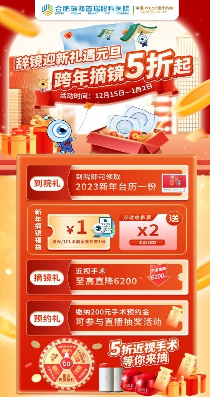 不想再做苦哈哈近视党,想摆脱眼镜?给你支个招,即日起至1月2日元旦期间来合肥瑶海普瑞眼科摘镜享受年度超低价,全年最后一波,错过就要等一年!就这点福利?当然不是!缴纳手术预约金还可参与元旦活动专场直播。这场直播有多炸?现场直接抽5折近视手术名额!用半价在年底摘掉眼镜,美美地跨向新年它不香吗?不仅如此,还有SKII大红瓶面霜、电火锅、500元超市购物卡、油卡等超多大奖等你来抽!这还不够!活动期间,到院即可领新年好礼一份。到院检查还可以1元购新年摘镜福袋,全套近视手术术前检查、电影通票2张1块钱直接给到你哦!