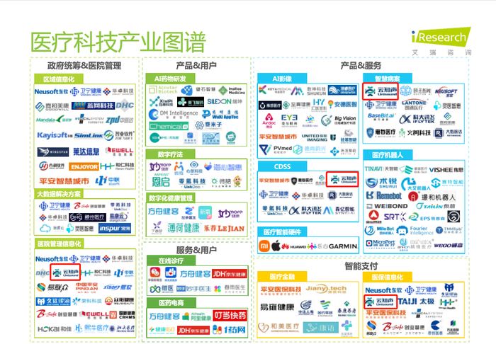 在行业细分赛道分析中,该报告将医疗科技行业划分为政府统筹&医院管理、产品& 服务、服务&用户、产品&用户、智能支付五大类15个细分子行业,以图谱形式系统展现行业脉络分支。云知声在智慧病案、CDSS、医院管理信息化、医保信息化4个细分子行业中均有触达,其AI应用渗透的深度和广度,可见一斑。