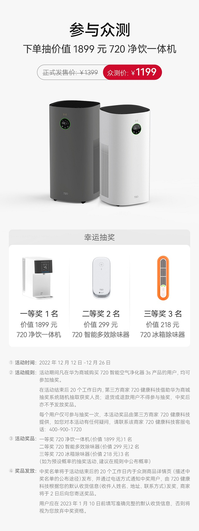 1199元!华为智选 720智能空气净化器3s华为商城首发众测