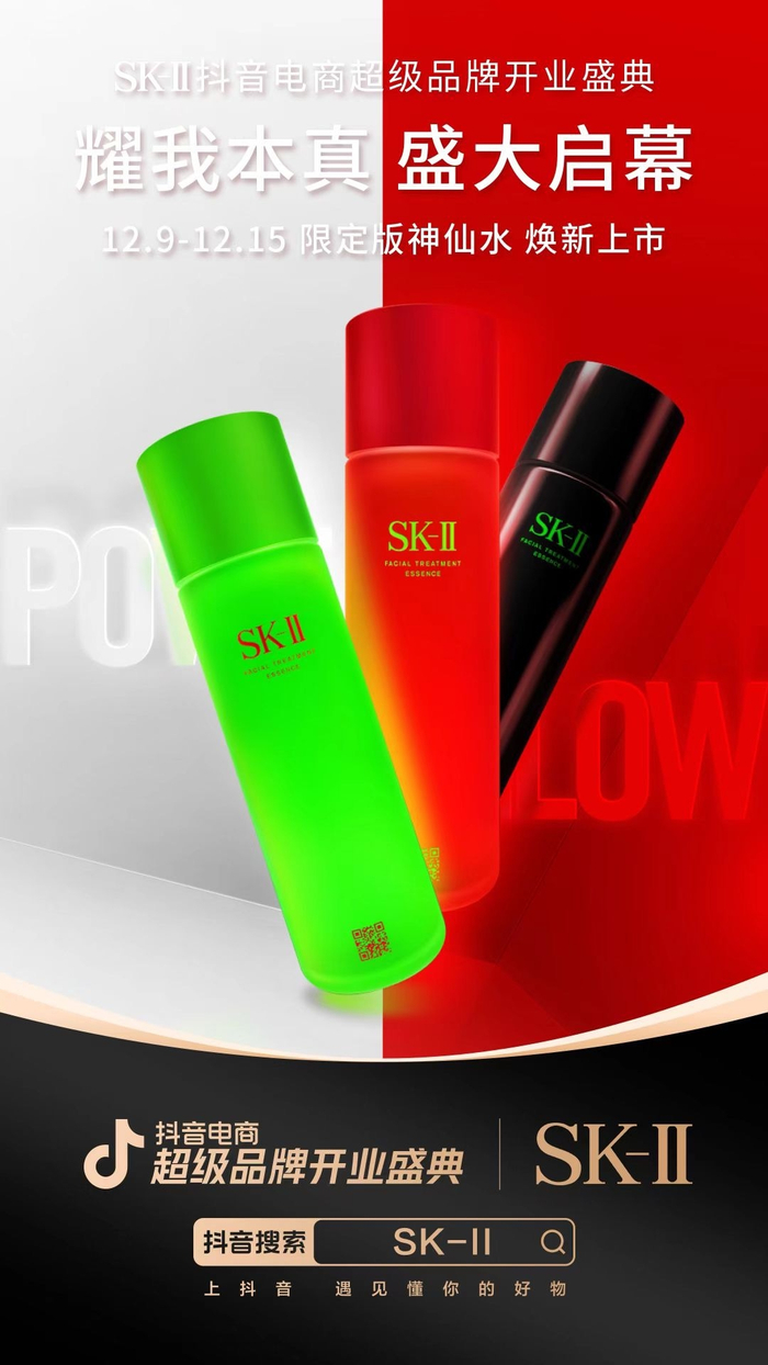 12月9日至15日期间,国际护肤品大牌SK-II携手抖音电商超级品牌开业盛典,重磅入驻抖音电商,借助圣诞月别具一格的节日氛围,推出限定版神仙水新品,联合明星、达人等资源在站内外打造新品营销事件。活动期间,SK-II抖音电商超级品牌开业盛典以充满仪式感、惊喜感的全链路营销玩法为品牌提效,满足广大消费者对新品营销的诉求:站外联合时尚芭莎深度定制内容,提升品牌全域影响力;在站内则通过创意互动玩法及搜索产品功能,打造热点话题助力品牌承接转化,为SK-II品牌热度奠定扎实根基。据悉,SK-II抖音电商超级品牌开业盛典活动期间,品牌搜索PV提升170%,搜索GMV提升300%。