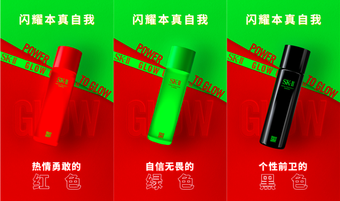 据了解,新包装有「红、绿、黑」三种款式,其中红色象征着热烈、勇敢的情感特性,绿色代表着自信、无畏的蓬勃精神,黑色代表着个性、前卫的年轻态度,从产品新包装到宣传海报,都展示着张扬亮眼的风格,不仅成功聚拢了年轻一代的目光,也打响了SK-II品牌年轻化的新战役。