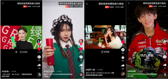 其次,SK-II抖音电商超级品牌开业盛典还通过品牌节日限定版新品,在站内打造热榜话题#假如性格有颜色接力挑战,通过每一种颜色代表着不同的性格和内心情绪,如红色代表热烈勇敢、绿色代表自由无畏,让被困在当下生活中的年轻人们,用「颜色」彰显出个人态度和价值取向,在选择“颜色”的表象下,表达自己真实的态度和声音,不断突破,挣脱束缚,做真实、自由、自信闪耀的自己。