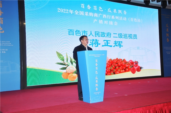 百色市人民政府二级巡视员蒋正辉表示,多年来,自治区商务厅给予百色大力支持,今天举办的全国采购商广西行系列活动(百色站)产销对接会,是“全国采购商广西行”系列活动之一,既是深入实施“桂品出乡”,助力乡村振兴的创新之举,又是全国采购商与广西农产品品牌企业交流合作的重要平台。今年6月份起开展的“全国采购商广西行”系列活动,已先后在钦州、玉林、南宁、百色、柳州等地市举办。通过搭建产销对接平台,举办巡展活动,有效推动广西特产走出去;通过打造区域品牌,培育了一批享誉全国的广西特产品牌。
