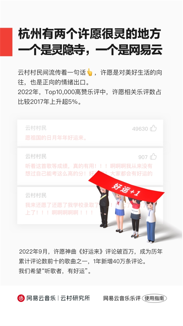 值得关注的是,许愿相关的乐评数也在持续上升,寄托了用户对美好生活的向往。《报告》显示,2022年平台点赞量前1万的评论中,许愿/还愿相关的乐评数占比较2017年上升超5%。2022年9月,有“云村许愿神曲”之称的《好运来》评论破百万,成为网易云音乐历年累计评论数前十的歌曲之一。2021年7月至2022年6月,不到一年的时间里,《好运来》评论区新增了40万条乐评。而且在它点赞量前一万的乐评中,每100条评论就有12条提到“还愿”。