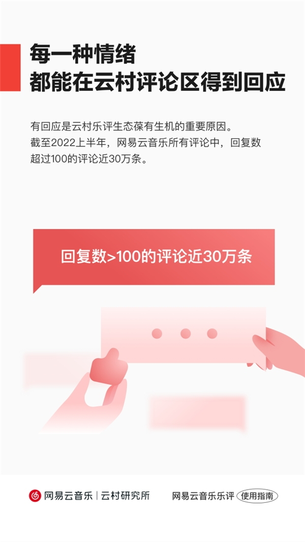 作为一款情绪产品,网易云音乐认为每一种情绪都是真实的并有其合理性,也终将找到出口,而有回应则是乐评生态葆有生机的重要原因。截至2022上半年,网易云音乐所有评论中,回复数超过100的评论有近30万条。