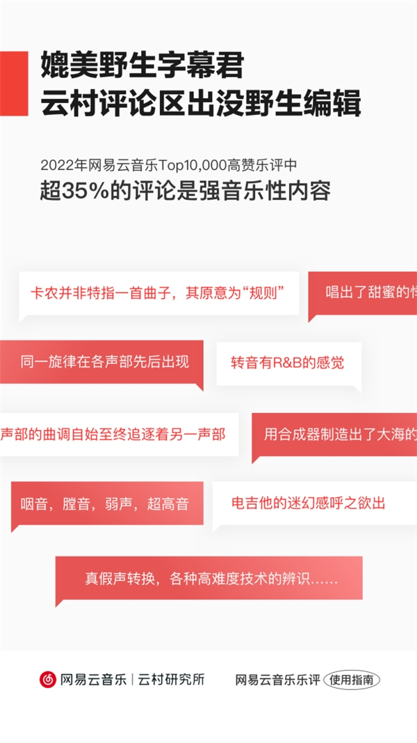 为更好地研究并展示云村乐评的面貌和变化趋势,2022年12月22日,在中国音像与数字出版协会音乐产业促进工作委员会指导下,网易云音乐云村研究所对外发布《网易云音乐乐评报告(2022)》(以下简称《报告》)。