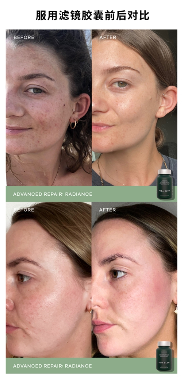 Vida Glow滤镜胶囊还添加了焕亮元素谷胱甘肽、半胱氨酸和多种强大活性成分,实现了由内而外淡化斑点、均匀和提亮肤色的神奇效果,同时还能防止黑色素沉积,预防新的色斑、瑕疵产生,打造持久透亮的无瑕美肌。显著的服用前后效果对比迅速征服全球用户,成为越来越多人渴望尝试的一款现实版肤色“滤镜”。
